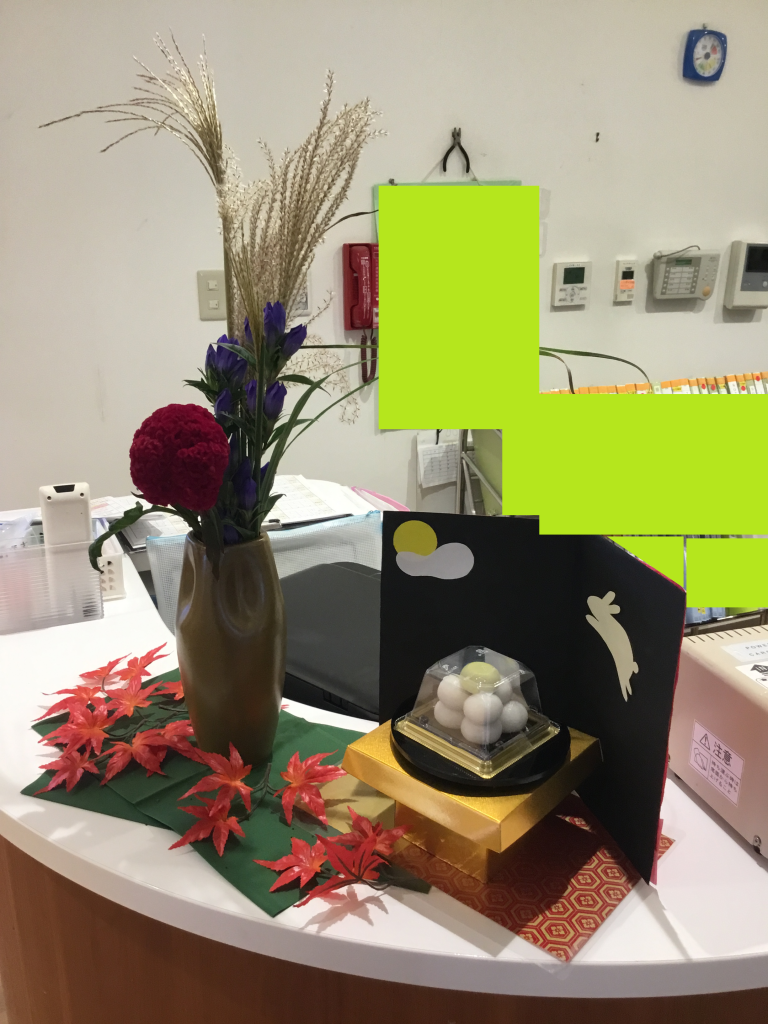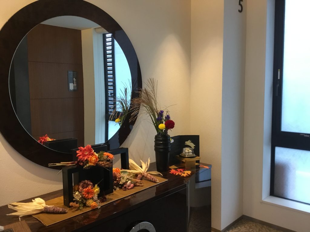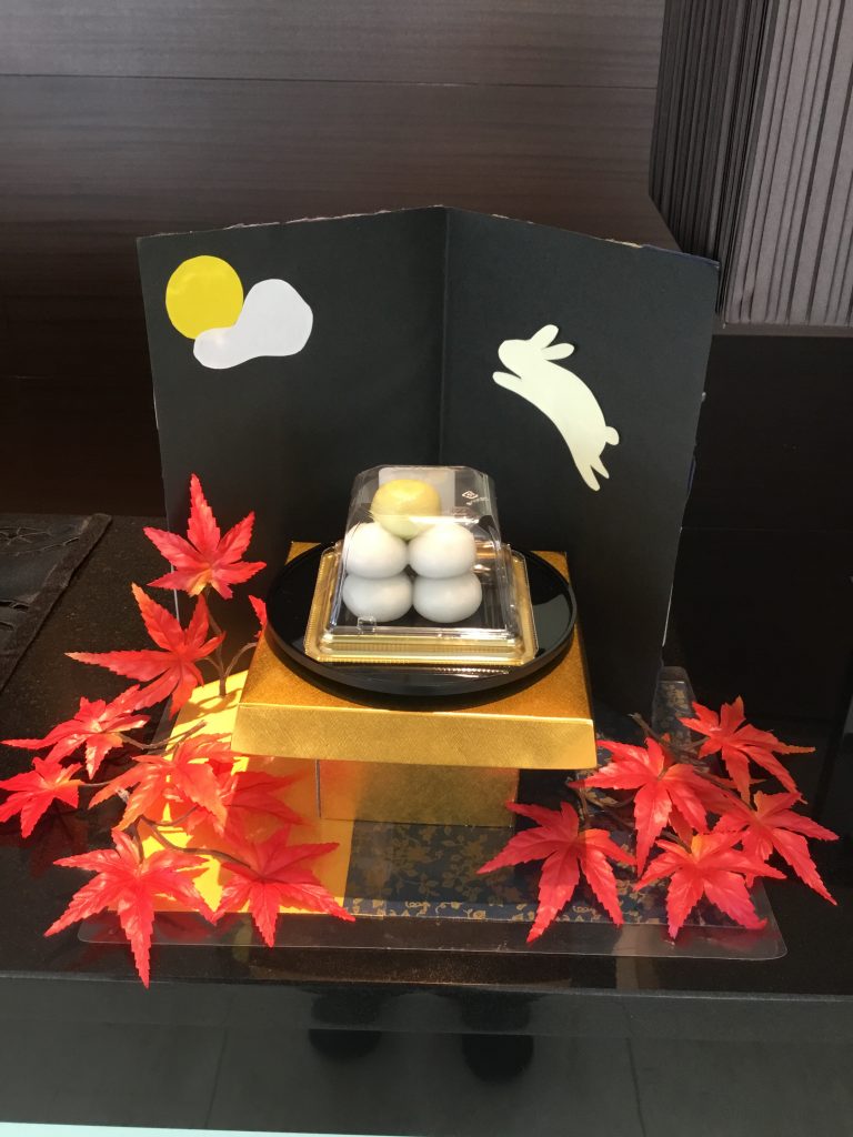 レジデンスでも館内で季節を楽しんでいただけるようススキやケイトウ、お月さまをイメージした菊の花と月見団子を飾りました(*’▽’)